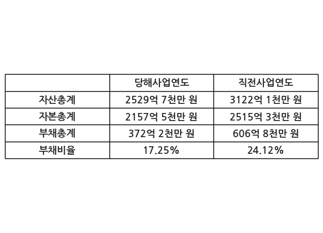 또한, 이번사업연도의 자산총계는 2529억 7천만 원으로 직전사업연도 대비 -18.97% 감소한 한편, 부채총계는 372억 2천만 원으로 -38.67% 감소, 자본총계는 2157억 5천만 원으로 -14.22% 감소했다.
