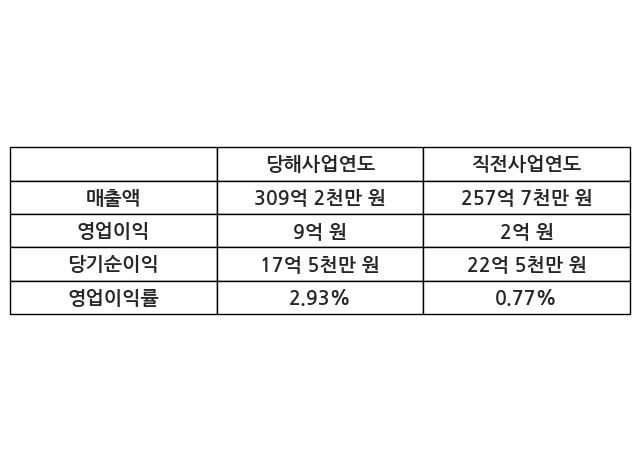 이번사업연도의 매출액은 직전사업연도 대비 19.97% 증가한 309억 2천만 원, 영업이익은 9억 원, 당기순이익은 17억 5천만 원이라고 공시했다.