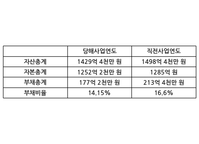 또한, 이번사업연도의 자산총계는 1429억 4천만 원으로 직전사업연도 대비 -4.6% 감소한 한편, 부채총계는 177억 2천만 원으로 -16.94% 감소, 자본총계는 1252억 2천만 원으로 -2.55% 감소했다.