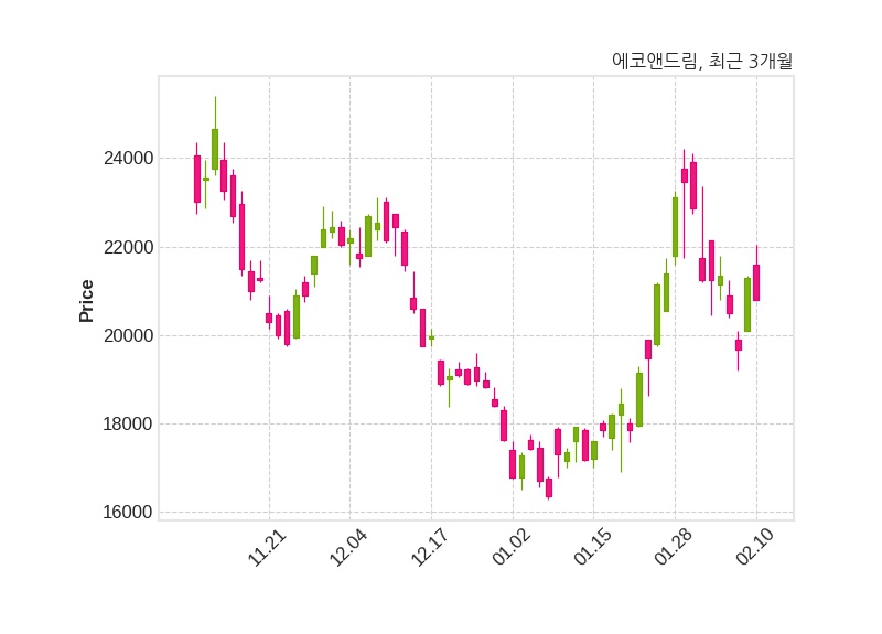 한편, 에코앤드림은 장 마감 이후 해당 기업공시를 발표했으며 오늘 종가가 20,800원, 거래량은 80,443주로, 직전 거래일 대비 500원(-2.35%) 하락했다.