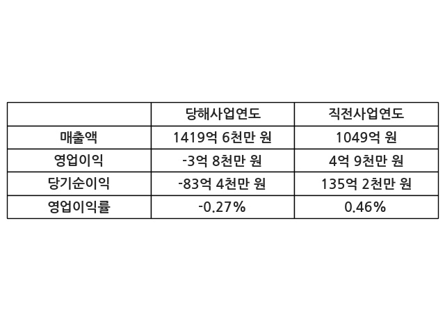 이번사업연도의 매출액은 직전사업연도 대비 35.33% 증가한 1419억 6천만 원, 영업이익은 -3억 8천만 원, 당기순이익은 -83억 4천만 원이라고 공시했다.