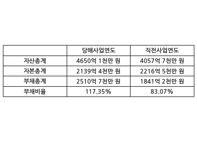 또한, 이번사업연도의 자산총계는 4650억 1천만 원으로 직전사업연도 대비 14.6% 증가한 한편, 부채총계는 2510억 7천만 원으로 36.36% 증가, 자본총계는 2139억 4천만 원으로 -3.48% 감소했다.