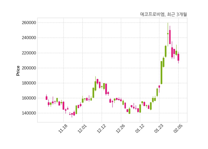 한편, 에코프로비엠의 13시 05분 현재주가는 210,000원으로 직전 거래일 대비 12,500원(-5.62%) 하락이며, 거래량은 665,008주이다.