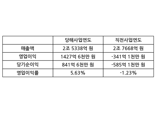 이번사업연도의 매출액은 직전사업연도 대비 -8.42% 감소한 2조 5338억 원, 영업이익은 1427억 6천만 원, 당기순이익은 841억 6천만 원이라고 공시했다.