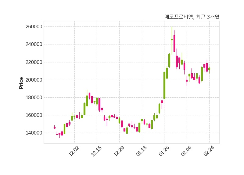 한편, 에코프로비엠은 장 마감 이후 해당 기업공시를 발표했으며 오늘 종가가 213,500원, 거래량은 472,468주로, 직전 거래일 대비 4,000원(+1.91%) 상승했다.