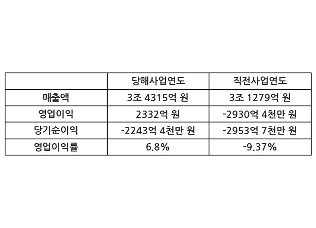 이번사업연도의 매출액은 직전사업연도 대비 9.71% 증가한 3조 4315억 원, 영업이익은 2332억 원, 당기순이익은 -2243억 4천만 원이라고 공시했다.