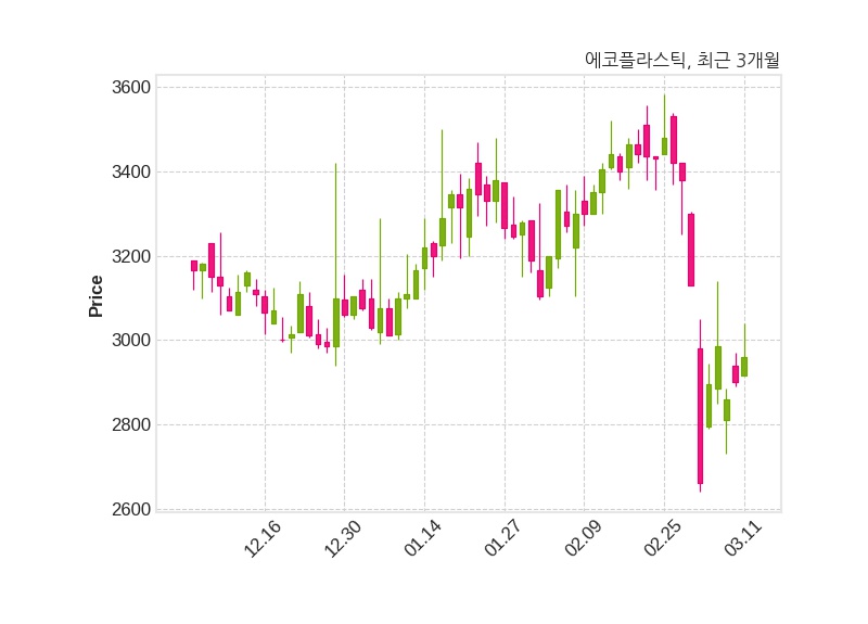 한편, 에코플라스틱은 장 마감 이후 해당 기업공시를 발표했으며 오늘 종가가 2,960원, 거래량은 308,251주로, 직전 거래일 대비 60원(+2.07%) 상승했다.