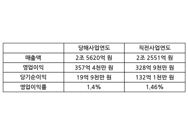 이번사업연도의 매출액은 직전사업연도 대비 13.61% 증가한 2조 5620억 원, 영업이익은 357억 4천만 원, 당기순이익은 19억 9천만 원이라고 공시했다.