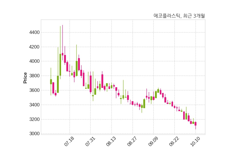 한편, 에코플라스틱은 장 마감 이후 해당 기업공시를 발표했으며 오늘 종가가 3,115원, 거래량은 267,685주로, 직전 거래일 대비 50원(-1.58%) 하락했다.