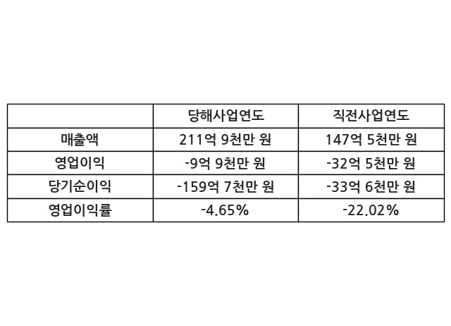 이번사업연도의 매출액은 직전사업연도 대비 43.66% 증가한 211억 9천만 원, 영업이익은 -9억 9천만 원, 당기순이익은 -159억 7천만 원이라고 공시했다.