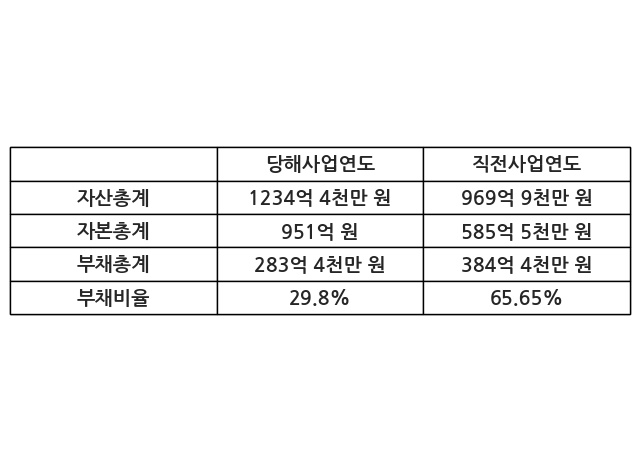 또한, 이번사업연도의 자산총계는 1234억 4천만 원으로 직전사업연도 대비 27.27% 증가한 한편, 부채총계는 283억 4천만 원으로 -26.27% 감소, 자본총계는 951억 원으로 62.42% 증가했다.