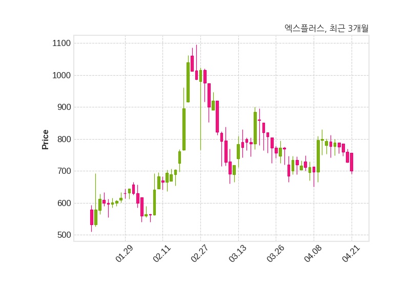 한편, 엑스플러스는 장 마감 이후 해당 기업공시를 발표했으며 오늘 종가가 700원, 거래량은 480,548주로, 직전 거래일 대비 27원(-3.71%) 하락했다.