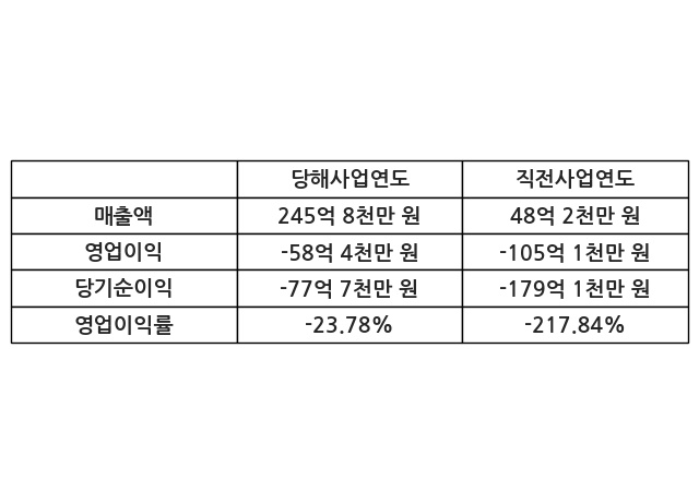 이번사업연도의 매출액은 직전사업연도 대비 409.34% 증가한 245억 8천만 원, 영업이익은 -58억 4천만 원, 당기순이익은 -77억 7천만 원이라고 공시했다.
