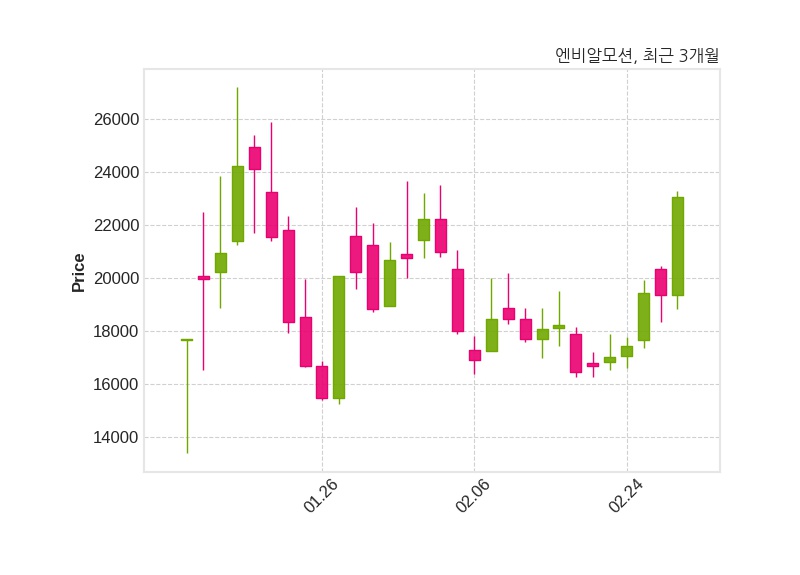 한편, 엔비알모션의 14시 24분 현재주가는 23,050원으로 직전 거래일 대비 3,700원(+19.12%) 상승이며, 거래량은 2,909,296주이다.
