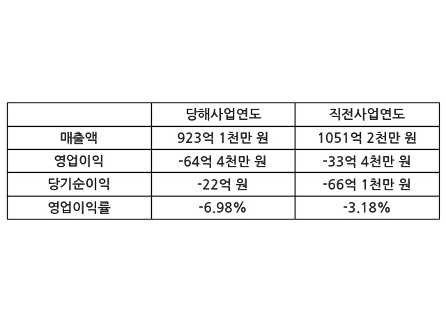 이번사업연도의 매출액은 직전사업연도 대비 -12.18% 감소한 923억 1천만 원, 영업이익은 -64억 4천만 원, 당기순이익은 -22억 원이라고 공시했다.