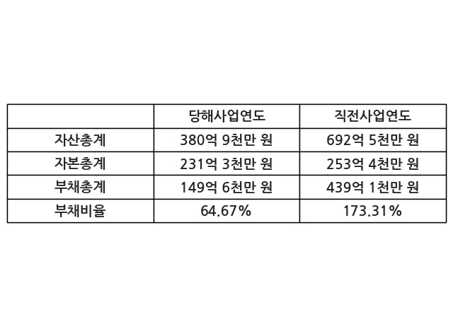 또한, 이번사업연도의 자산총계는 380억 9천만 원으로 직전사업연도 대비 -44.99% 감소한 한편, 부채총계는 149억 6천만 원으로 -65.93% 감소, 자본총계는 231억 3천만 원으로 -8.7% 감소했다.