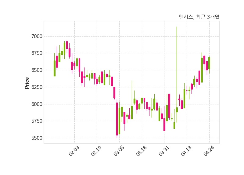한편, 엔시스의 10시 25분 현재주가는 6,690원으로 직전 거래일 대비 190원(+2.92%) 상승이며, 거래량은 21,627주이다.