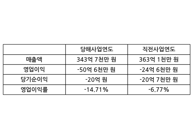 이번사업연도의 매출액은 직전사업연도 대비 -5.35% 감소한 343억 7천만 원, 영업이익은 -50억 6천만 원, 당기순이익은 -20억 원이라고 공시했다.