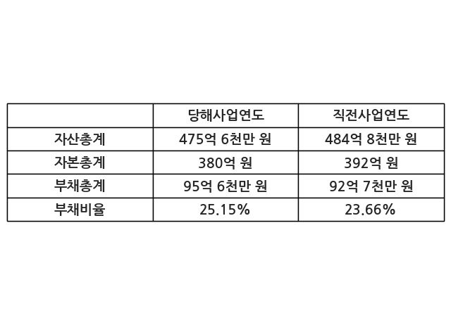 또한, 이번사업연도의 자산총계는 475억 6천만 원으로 직전사업연도 대비 -1.89% 감소한 한편, 부채총계는 95억 6천만 원으로 3.07% 증가, 자본총계는 380억 원으로 -3.06% 감소했다.
