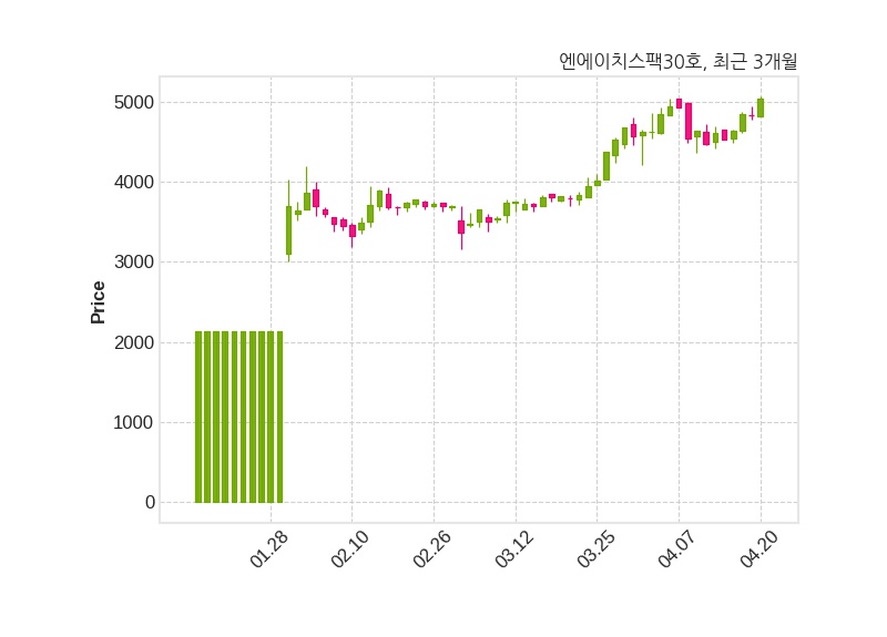 한편, 엔에이치스팩30호는 장 마감 이후 해당 기업공시를 발표했으며 오늘 종가가 5,040원, 거래량은 274,403주로, 직전 거래일 대비 215원(+4.46%) 상승했다.