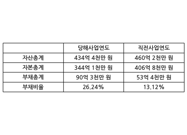 또한, 이번사업연도의 자산총계는 434억 4천만 원으로 직전사업연도 대비 -5.62% 감소한 한편, 부채총계는 90억 3천만 원으로 69.1% 증가, 자본총계는 344억 1천만 원으로 -15.43% 감소했다.