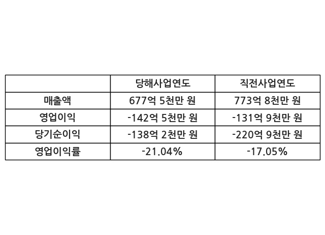 이번사업연도의 매출액은 직전사업연도 대비 -12.44% 감소한 677억 5천만 원, 영업이익은 -142억 5천만 원, 당기순이익은 -138억 2천만 원이라고 공시했다.