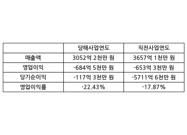 이번사업연도의 매출액은 직전사업연도 대비 -16.54% 감소한 3052억 2천만 원, 영업이익은 -684억 5천만 원, 당기순이익은 -117억 3천만 원이라고 공시했다.