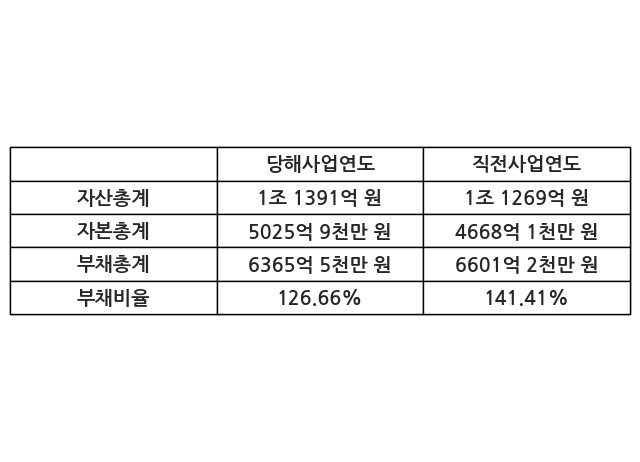 또한, 이번사업연도의 자산총계는 1조 1391억 원으로 직전사업연도 대비 1.08% 증가한 한편, 부채총계는 6365억 5천만 원으로 -3.57% 감소, 자본총계는 5025억 9천만 원으로 7.66% 증가했다.