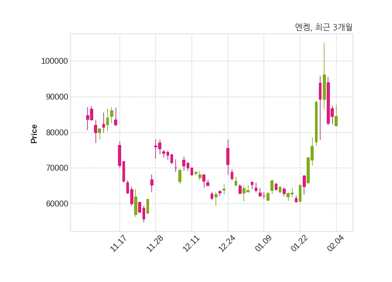 한편, 엔켐은 장 마감 이후 해당 기업공시를 발표했으며 오늘 종가가 84,400원, 거래량은 350,083주로, 직전 거래일 대비 변동이없다.