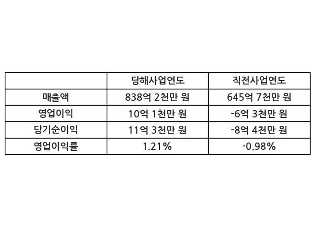 이번사업연도의 매출액은 직전사업연도 대비 29.82% 증가한 838억 2천만 원, 영업이익은 10억 1천만 원, 당기순이익은 11억 3천만 원이라고 공시했다.