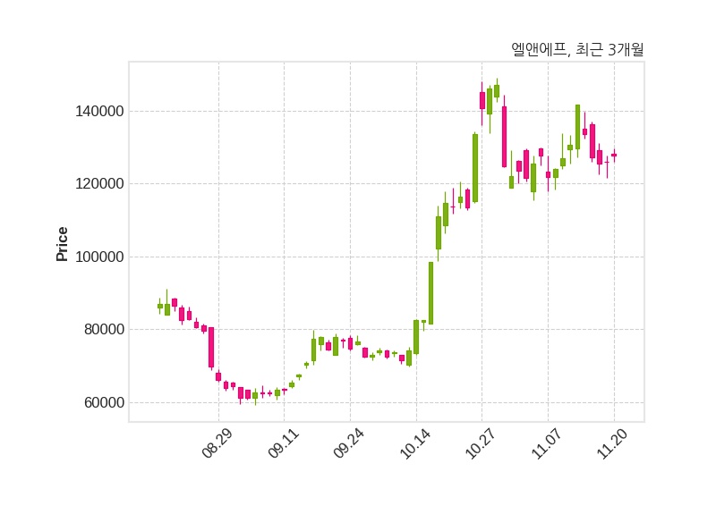 한편, 엘앤에프는 장 마감 이후 해당 기업공시를 발표했으며 오늘 종가가 127,800원, 거래량은 271,911주로, 직전 거래일 대비 1,800원(+1.43%) 상승했다.