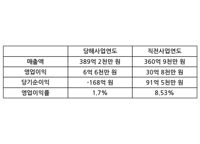 이번사업연도의 매출액은 직전사업연도 대비 7.84% 증가한 389억 2천만 원, 영업이익은 6억 6천만 원, 당기순이익은 -168억 원이라고 공시했다.