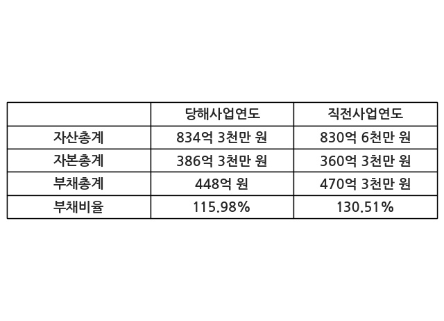 또한, 이번사업연도의 자산총계는 834억 3천만 원으로 직전사업연도 대비 0.44% 증가한 한편, 부채총계는 448억 원으로 -4.74% 감소, 자본총계는 386억 3천만 원으로 7.2% 증가했다.