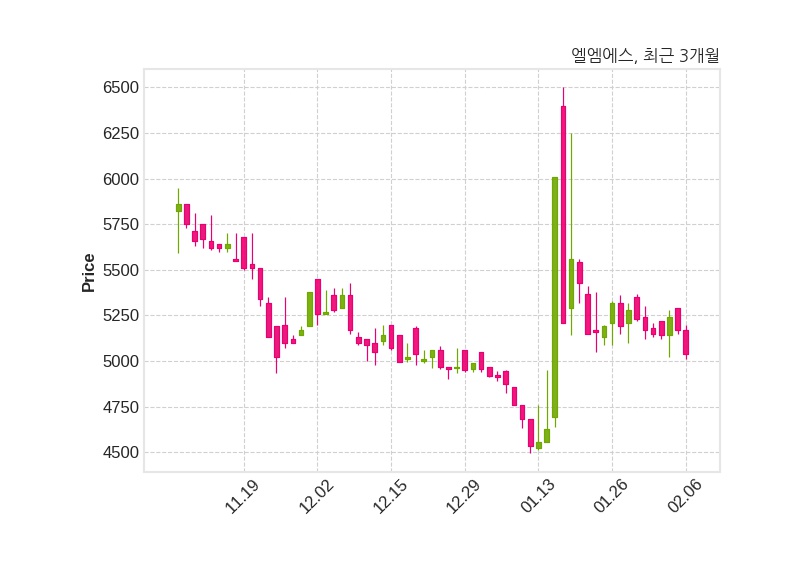 한편, 엘엠에스는 장 마감 이후 해당 기업공시를 발표했으며 오늘 종가가 5,040원, 거래량은 10,094주로, 직전 거래일 대비 130원(-2.51%) 하락했다.