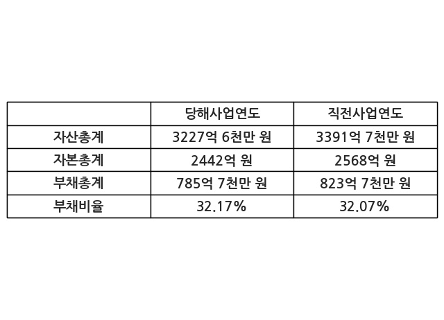 또한, 이번사업연도의 자산총계는 3227억 6천만 원으로 직전사업연도 대비 -4.84% 감소한 한편, 부채총계는 785억 7천만 원으로 -4.62% 감소, 자본총계는 2442억 원으로 -4.91% 감소했다.