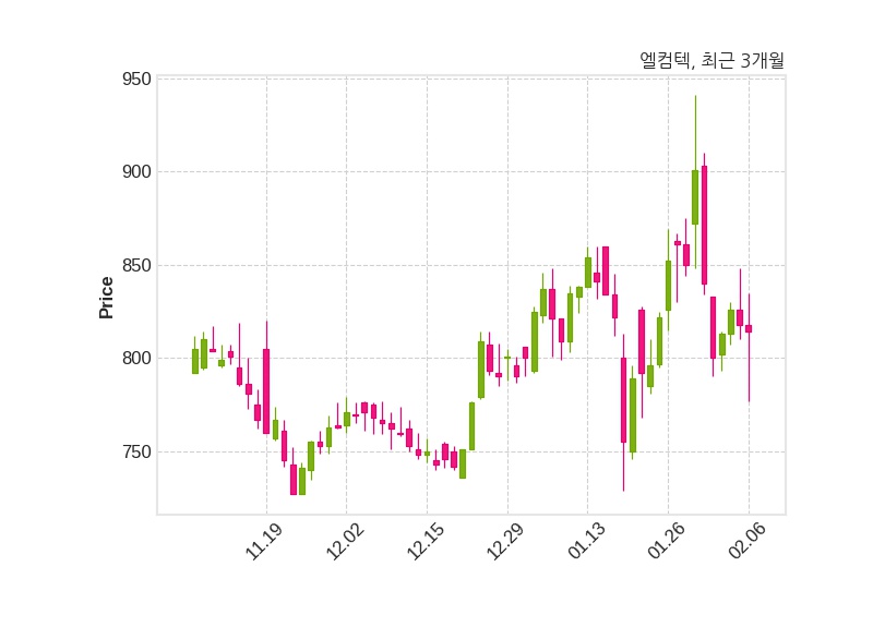 한편, 엘컴텍은 장 마감 이후 해당 기업공시를 발표했으며 오늘 종가가 814원, 거래량은 630,844주로, 직전 거래일 대비 4원(-0.49%) 하락했다.