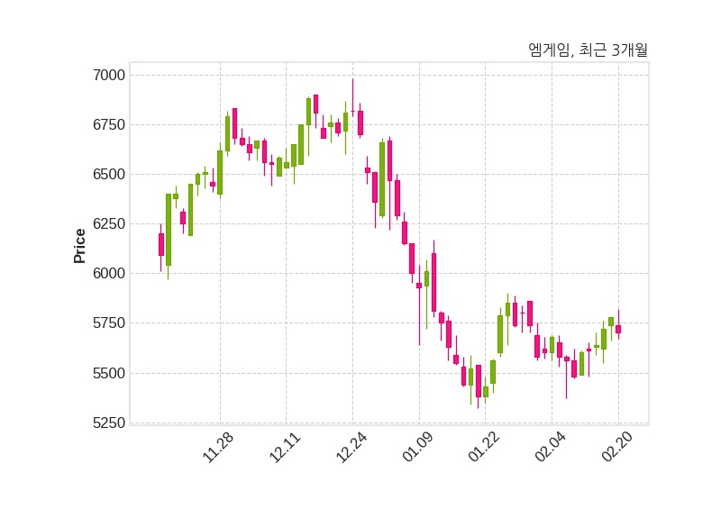 한편, 엠게임은 장 마감 이후 해당 기업공시를 발표했으며 오늘 종가가 5,700원, 거래량은 65,826주로, 직전 거래일 대비 80원(-1.38%) 하락했다.