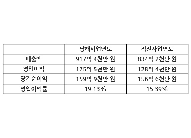 이번사업연도의 매출액은 직전사업연도 대비 9.97% 증가한 917억 4천만 원, 영업이익은 175억 5천만 원, 당기순이익은 159억 9천만 원이라고 공시했다.