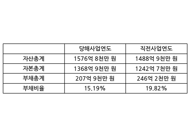 또한, 이번사업연도의 자산총계는 1576억 8천만 원으로 직전사업연도 대비 5.9% 증가한 한편, 부채총계는 207억 9천만 원으로 -15.56% 감소, 자본총계는 1368억 9천만 원으로 10.16% 증가했다.