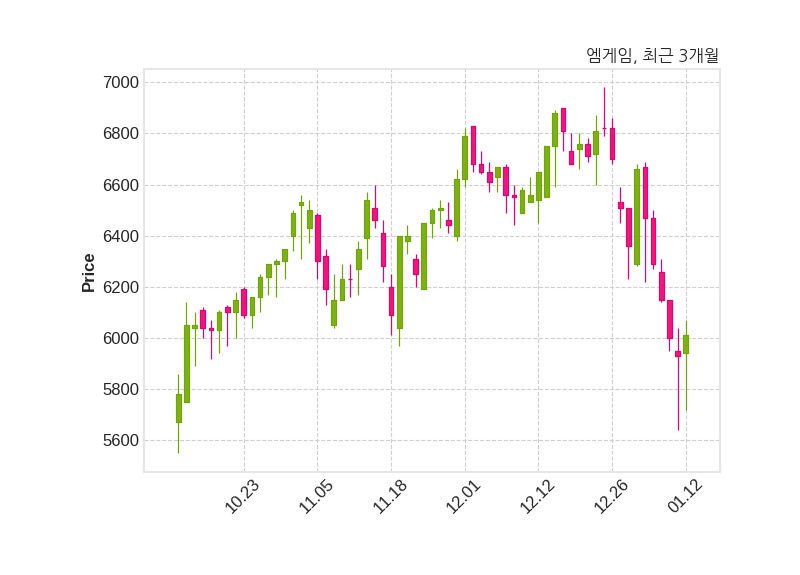 한편, 엠게임은 장 마감 이후 해당 기업공시를 발표했으며 오늘 종가가 6,010원, 거래량은 66,704주로, 직전 거래일 대비 80원(+1.35%) 상승했다.