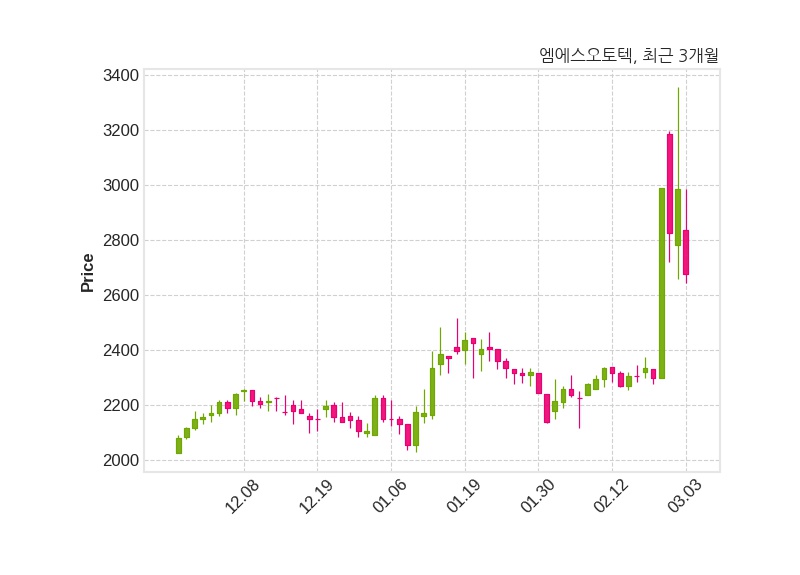 한편, 엠에스오토텍은 장 마감 이후 해당 기업공시를 발표했으며 오늘 종가가 2,675원, 거래량은 2,096,379주로, 직전 거래일 대비 310원(-10.39%) 하락했다.