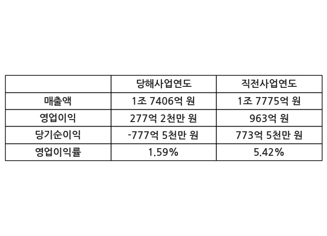 이번사업연도의 매출액은 직전사업연도 대비 -2.08% 감소한 1조 7406억 원, 영업이익은 277억 2천만 원, 당기순이익은 -777억 5천만 원이라고 공시했다.