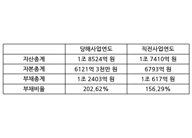 또한, 이번사업연도의 자산총계는 1조 8524억 원으로 직전사업연도 대비 6.4% 증가한 한편, 부채총계는 1조 2403억 원으로 16.82% 증가, 자본총계는 6121억 3천만 원으로 -9.89% 감소했다.