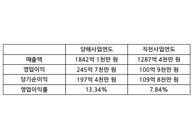 이번사업연도의 매출액은 직전사업연도 대비 43.08% 증가한 1842억 1천만 원, 영업이익은 245억 7천만 원, 당기순이익은 197억 4천만 원이라고 공시했다.