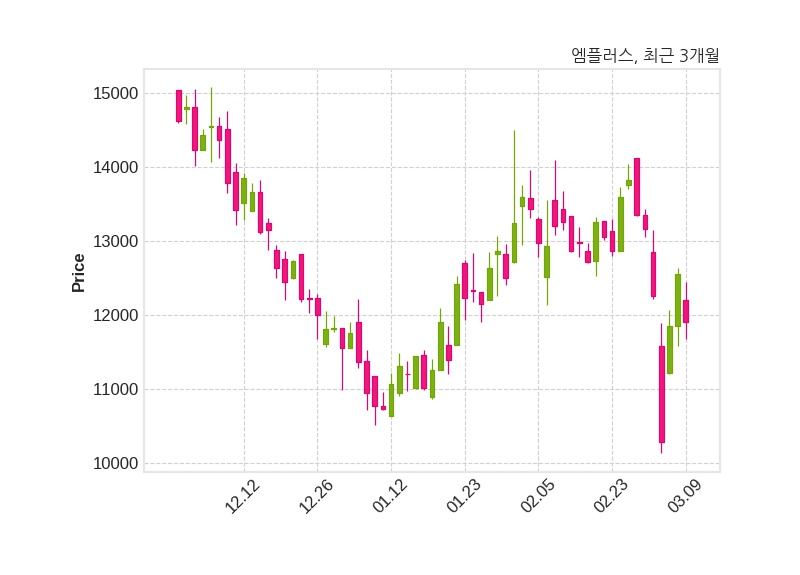 한편, 엠플러스의 14시 54분 현재주가는 11,910원으로 직전 거래일 대비 650원(-5.18%) 하락이며, 거래량은 206,751주이다.