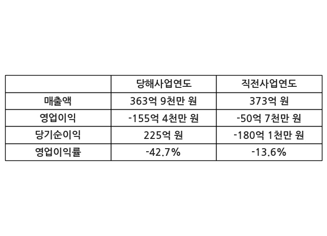 이번사업연도의 매출액은 직전사업연도 대비 -2.43% 감소한 363억 9천만 원, 영업이익은 -155억 4천만 원, 당기순이익은 225억 원이라고 공시했다.