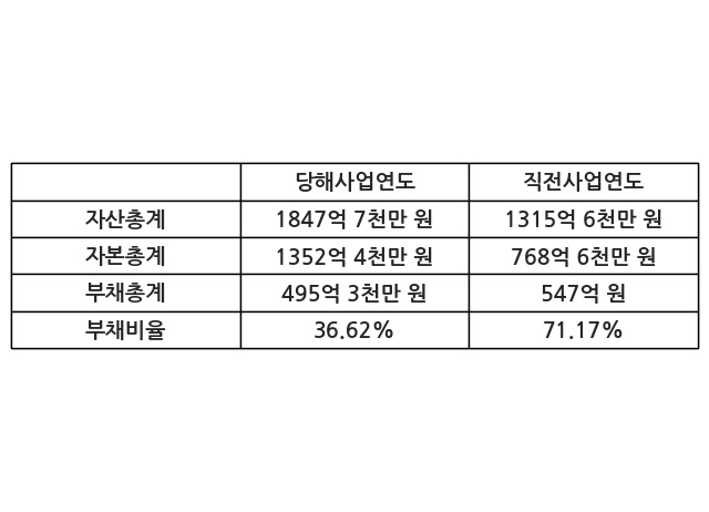 또한, 이번사업연도의 자산총계는 1847억 7천만 원으로 직전사업연도 대비 40.44% 증가한 한편, 부채총계는 495억 3천만 원으로 -9.46% 감소, 자본총계는 1352억 4천만 원으로 75.95% 증가했다.