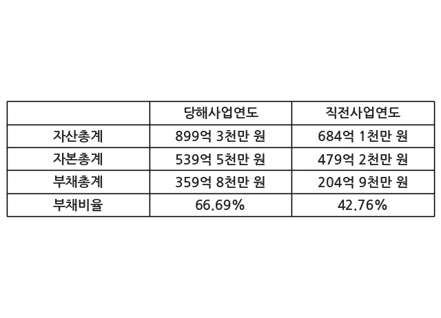 또한, 이번사업연도의 자산총계는 899억 3천만 원으로 직전사업연도 대비 31.47% 증가한 한편, 부채총계는 359억 8천만 원으로 75.6% 증가, 자본총계는 539억 5천만 원으로 12.6% 증가했다.