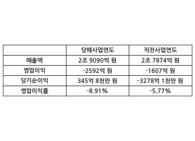 이번사업연도의 매출액은 직전사업연도 대비 4.36% 증가한 2조 9090억 원, 영업이익은 -2592억 원, 당기순이익은 345억 8천만 원이라고 공시했다.