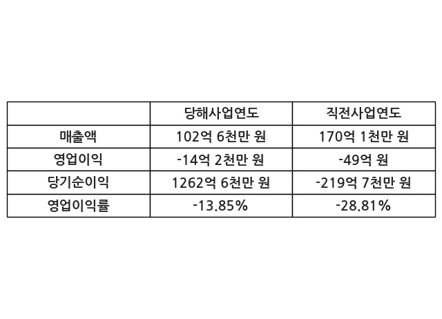 이번사업연도의 매출액은 직전사업연도 대비 -39.68% 감소한 102억 6천만 원, 영업이익은 -14억 2천만 원, 당기순이익은 1262억 6천만 원이라고 공시했다.